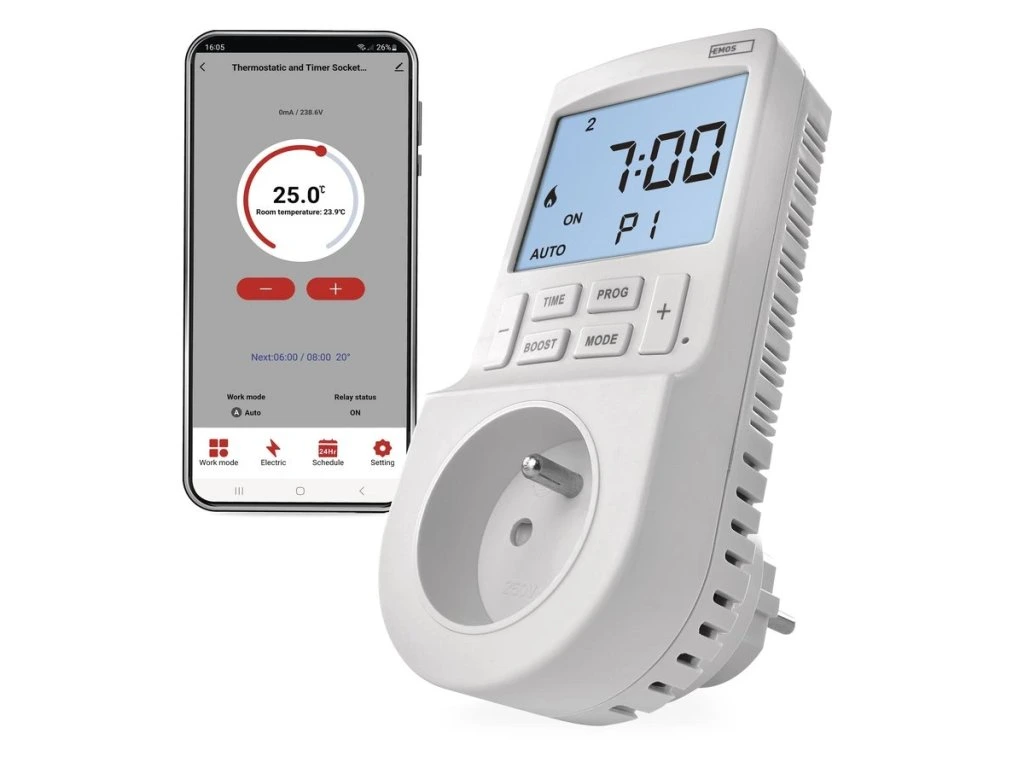 Multifunkční digitální zásuvku využijete jako časovač např. pro světelnou výzdobu nebo praktický termostat. Funkci termostatu využijete k automatické regulaci elektrických topných i chladících soustav jako jsou přímotopy, topné žebříky či klimatizace. Stačí zmáčknout tlačítko a zvolit si teplotu v rozsahu od 5 °C do 40 °C.