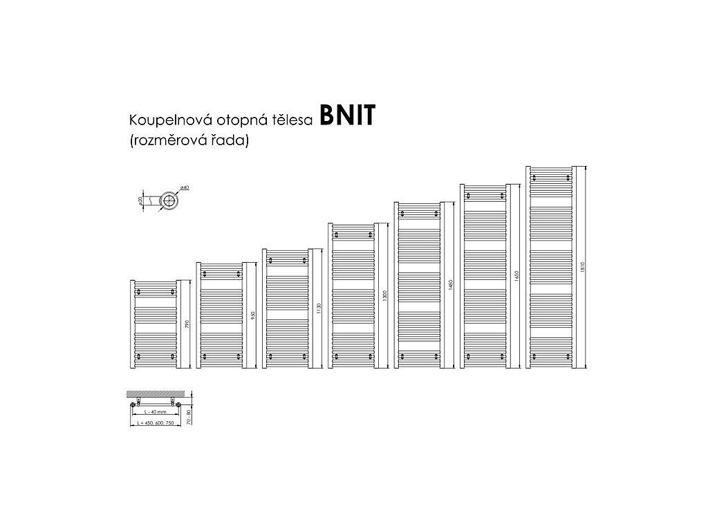Elektrický nerezový radiátor BNIT.E v rovném provedení je vyroben z příčných nerezových trubek o průměru 20 mm a dvou vertikálních nerezových stojin o průměru 40 mm. Elektrické radiátory jsou plněny speciální nemrznoucí směsí do -7 °C. Elektrické radiátory řady BNIT.E jsou standardně dodávány s povrchovou úpravou nerez-lesk a nerez-kartáč. K pevné elektrické síti se připojuje prostřednictvím instalační krabice s předřazeným regulátorem prostorové teploty nebo časovačem. Rozměry: délka 600 mm, výška 950 mm, hloubka 70 mm, provozní napětí 230 V, elektrický příkon 300 W, el. třída I, krytí IP 44.
