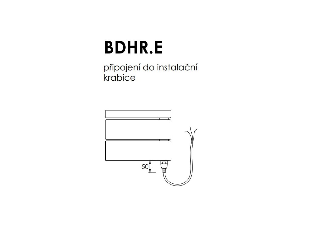 BDHR.E bez regulaceElektrický koupelnový radiátor – sušák BDHR.E je dodáván osazený elektrickým topným tělesem EL.05 E vybaveným omezovačem teploty, který zamezuje přehřátí radiátoru. V tomto provedení je elektrický trubkový radiátor bez možnosti regulace výkonu. Koupelnový radiátor s topnou tyčí a náplní BDHR.E je nabízen s rovným přívodním kabelem pro připojení k elektrické síti přes instalační krabici pevného elektrického rozvodu. Přívod lze opatřit síťovou vidlicí se spínačem VS1 nebo el. regulátorem teploty. BDHR.E je v nabídce i s krouceným přívodním kabelem opatřeným síťovou vidlicí.