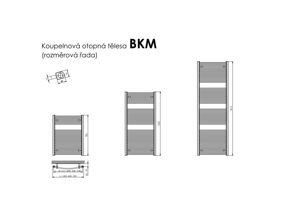 Elektrický radiátor BKM vychází ze základního typu BK. Zaujme svými příčnými plochooválnými profily tvarovanými do oblouků, které vytvářejí symetrii ploch s působivým ztvárněním hmoty. Elektrický radiátor řady BKM.E je tvořen z ocelových, mírně prohnutých oválných profilů o rozměrech 30 x 15 mm a dvou vertikálních stojin ve tvaru D o rozměru 35 x 41 mm. Je plněn nemrznoucí směsí do -7 °C. Radiátor nabízí výjimečnou kombinaci estetičnosti, funkčnosti a komfortu pro vytvoření harmonizující atmosféry ve Vaší koupelně. Základní provedení bílá barva RAL 9016. K pevné elektrické síti se připojuje prostřednictvím instalační krabice s předřazeným regulátorem prostorové teploty nebo časovačem. Rozměry: délka 450 mm, výška 1233 mm, hloubka 70 mm, hmotnost 16kg, provozní napětí 230V, el. příkon 400W, el. třída I, krytí IP44.