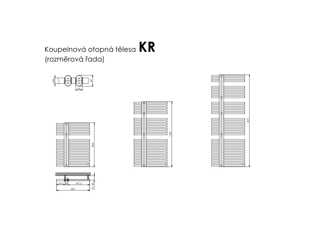 Netradiční koupelnový radiátor KR splňuje perfektně praktické požadavky na koupelnový radiátor a zároveň se stane originálním doplňkem vybavení interiéru moderní koupelny. Konstrukce radiátoru umožňuje jednoduché zavěšení ručníků ze strany. Na dvě svislé oválně stojiny v rozměru 30 x 50 mm navazují příčné ocelové trubky o průměru 26 mm s nenápadným 3-bodovým systémem uchycení na zeď. Rozteč 50 mm. Součástí radiátoru je hliníková lišta, kterou je možné kdykoliv odejmout a tím měnit vzhled radiátoru. Tento radiátor do koupelny je dodáván v délce 600 mm a výšce 800 mm, 1182 mm nebo 1670 mm.