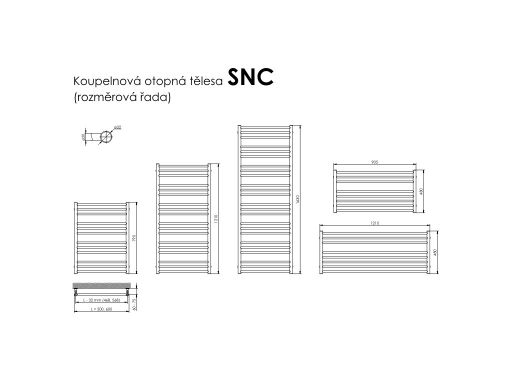 Elektrický radiátor SNC kombinace elegantního designu a důmyslného uchycení radiátoru ke stěně vytváří dokonalý estetický dojem. Elektrický radiátor SNC.ERK je tvořen z příčných ocelových trubek o průměru 20 mm a dvou vertikálních ocelových trubek o průměru 38 mm s povrchovou úpravou chrom. Je plněn nemrznoucí směsí do -7 °C. Je opatřen elektrickým topným tělesem s integrovaným regulátorem prostorové teploty a programem rychlého sušení po dobu 2 hod, je určeno pro přímý ohřev teplonosné látky v koupelnových radiátorech. Topné těleso EL.05 RK je řízeno mikroprocesorem, který zaručuje inteligentní a optimální provoz koupelnového radiátoru. Rozměry: délka 1210 mm, výška 480 mm, hloubka 48 mm, hmotnost12 kg, provozní napětí 230V, el. příkon 300W, el. třída I, krytí IP44.