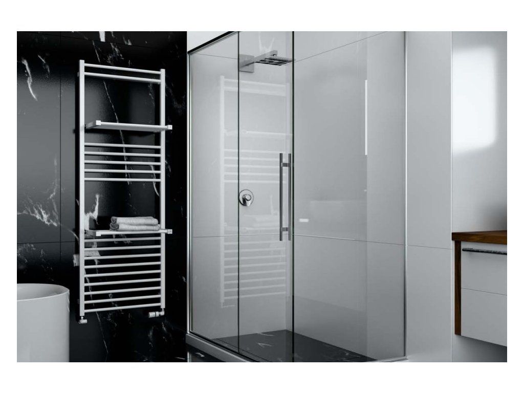 Klasický koupelnový žebřík s nezanedbatelnou nadhodnotou, výklopnými policemi na sušení, to je Flexi. Ve chvíli, kdy nepotřebujete využívat funkce sušení na sklopené polici, šetří prostor a slouží podobně jako běžný nástěnný radiátor.