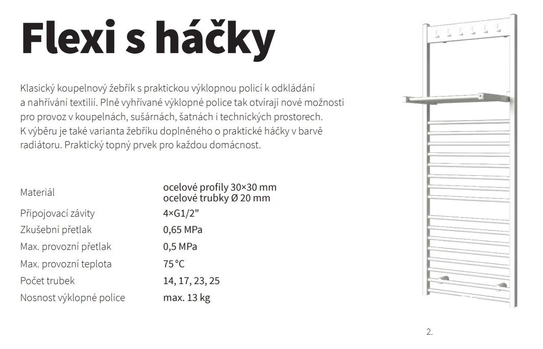 Klasický koupelnový žebřík s nezanedbatelnou nadhodnotou, výklopnými policemi na sušení, to je Flexi. Ve chvíli, kdy nepotřebujete využívat funkce sušení na sklopené polici, šetří prostor a slouží podobně jako běžný nástěnný radiátor.