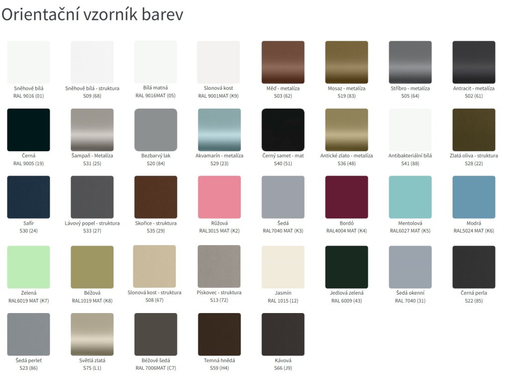 | ? Barva: | Antracit, Bezbarvý lak, Bílá, Černá, Červená, Khaki, Měděná, Modrá, Mosazná, Papyrus, Rubín, Růžová, Safírová, Slonová kost, Stříbrná, Šampaň, Šedá, Zelená, Zlatá, Žlutá |