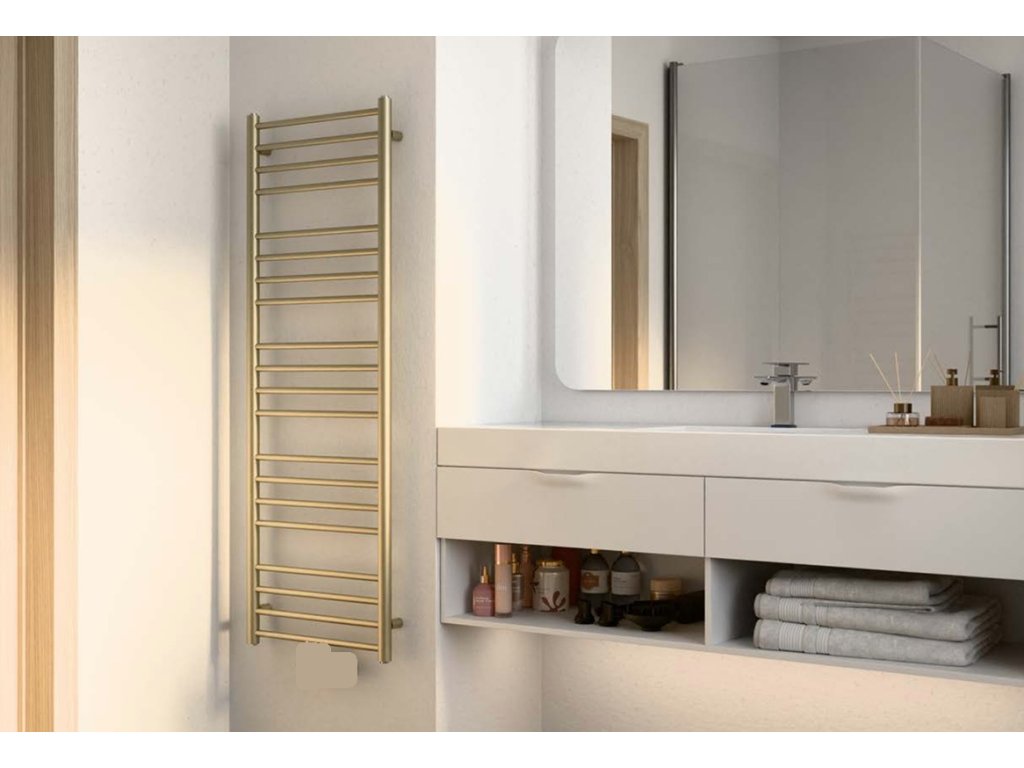 Elegantní koupelnový žebřík, který se vyznačuje čistými liniemi a moderním vzhledem. Jeho konstrukci tvoří ocelové trubky rovnoměrně rozložené po celé výšce, což zajišťuje harmonický design a efektivní vytápění.
