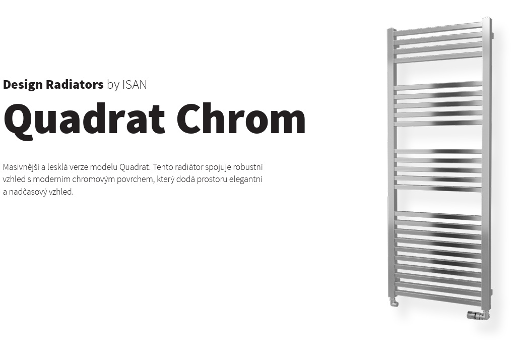 Otopné těleso / radiátor / topný žebřík: Isan Quadrat Chrom 1255/500 DQUA12550500SK. O výšce: 1255 mm a šířce 500 mm. Materiál: Ocel. Hranatý tvar tohoto tělesa je velmi líbivý a svým designem je vhodný do každé koupelny.