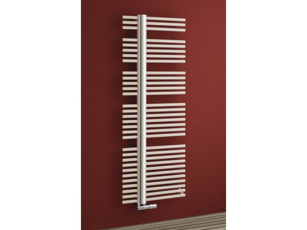 Radiátor Kronos KR3W od firmy PMH. Konstrukce tohoto radiátoru nabízí výhodu jednoduchého zavěšení ručníků ze strany. Na 2 svislé trubky navazují příčné trubky s nenápadným 3-bodovým systémem uchycení na zeď. Součástí Kronosu je hliníková lišta, kterou můžete kdykoliv odejmout a tím měnit vzhled radiátoru.