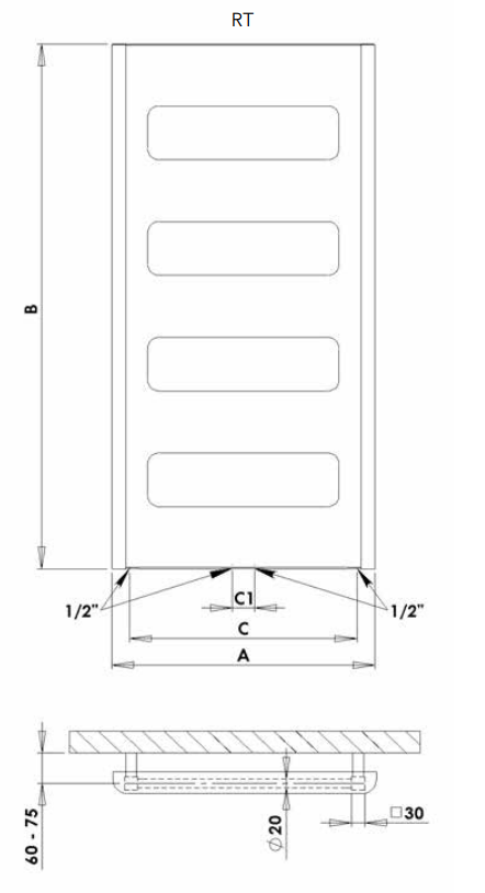 Radiátor Retro RT od firmy PMH. Zaoblená hrana radiátoru do koupelny navozuje vzhled masivního radiátoru. Trubky těsně kopírují kryt radiátoru a tím je zajištěno plynulé sundání ručníků. Systém montáže je stejný jako u radiátoru Pegasus. Radiátor lze napojit na středové připojení i po stranách.
