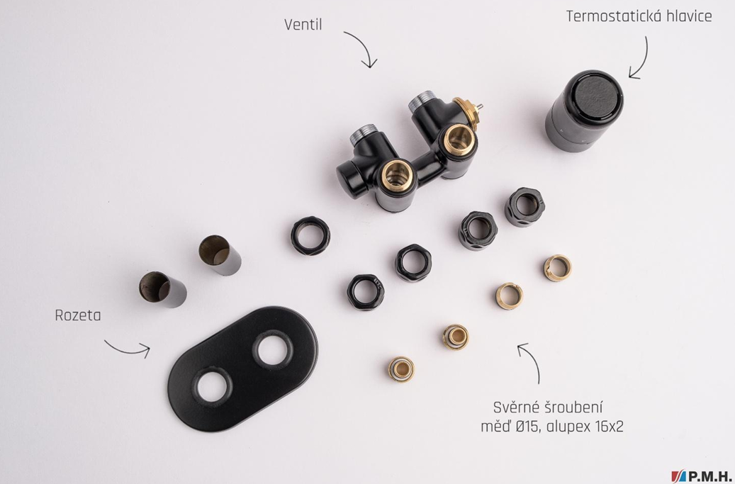 Kompletní sada obsahuje kromě ventilu také krycí rozety a svěrné šroubení pro připojení na měď potrubí 15 mm a Alupex 16 mm.