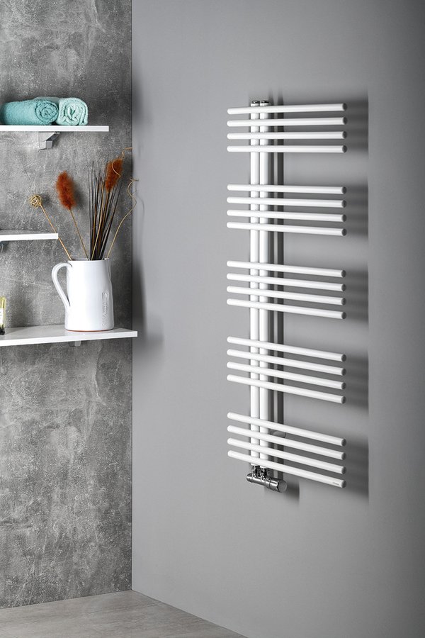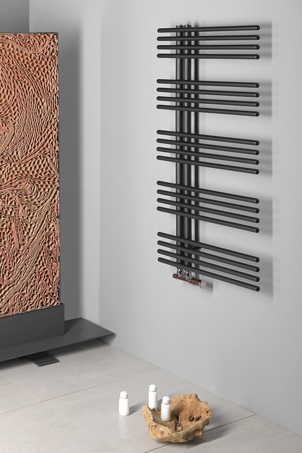 Klasické trubky s kruhovým profilem sestavené v designový radiátor Sapho Nympha, který lze díky středovému připojení s roztečí 50 mm kombinovat s designovými ventily z naší nabídky.