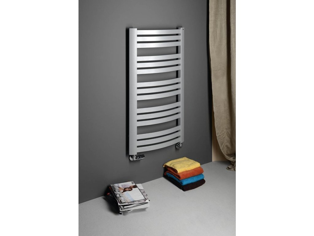 Dekorativní koupelnový radiátor s jemně prohnutými plochými trubkami s možností kombinace ústředního a elektrického vytápění.