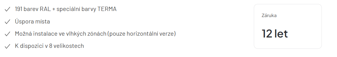 Terma je největší polský výrobce radiátorů s nepřetržitou tradicí od roku 1991. Dnes působí ve více než 40 zemích světa a patří k lídrům v designu topných těles v Evropě. Každý radiátor Terma vzniká v úzké spolupráci s předními designéry a inženýry — v nabídce najdete jak klasické koupelnové žebříky, tak originální designové kusy s odvážnými tvary a špičkovou povrchovou úpravou. Vybírat můžete z mnoha rozměrových variant, způsobů připojení a palety více než 250 barev včetně speciálních strukturálních povrchů. Produkty Terma jsou dostupné v teplovodním, elektrickém i kombinovaném provedení.