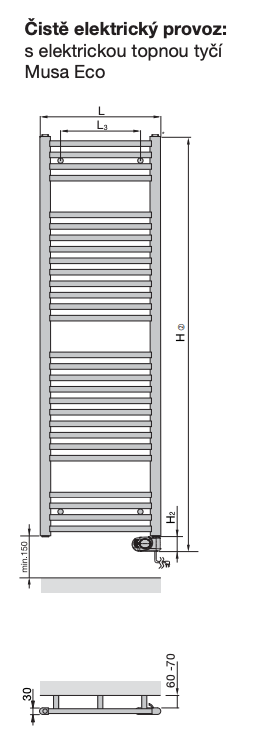 Dodáván s vestavěnou el. topnou tyčí Musa Eco, stupeň ochrany IP 44 (proti stříkající vodě), pro připojení do el. sítě 230 V, s přívodním kabelem (1,3 m) se zástrčkou. Topná tyč je vestavěna vpravo dole. Radiátor je plněn nehořlavým topným médiem. Součástí dodávky designové stěnové konzole.