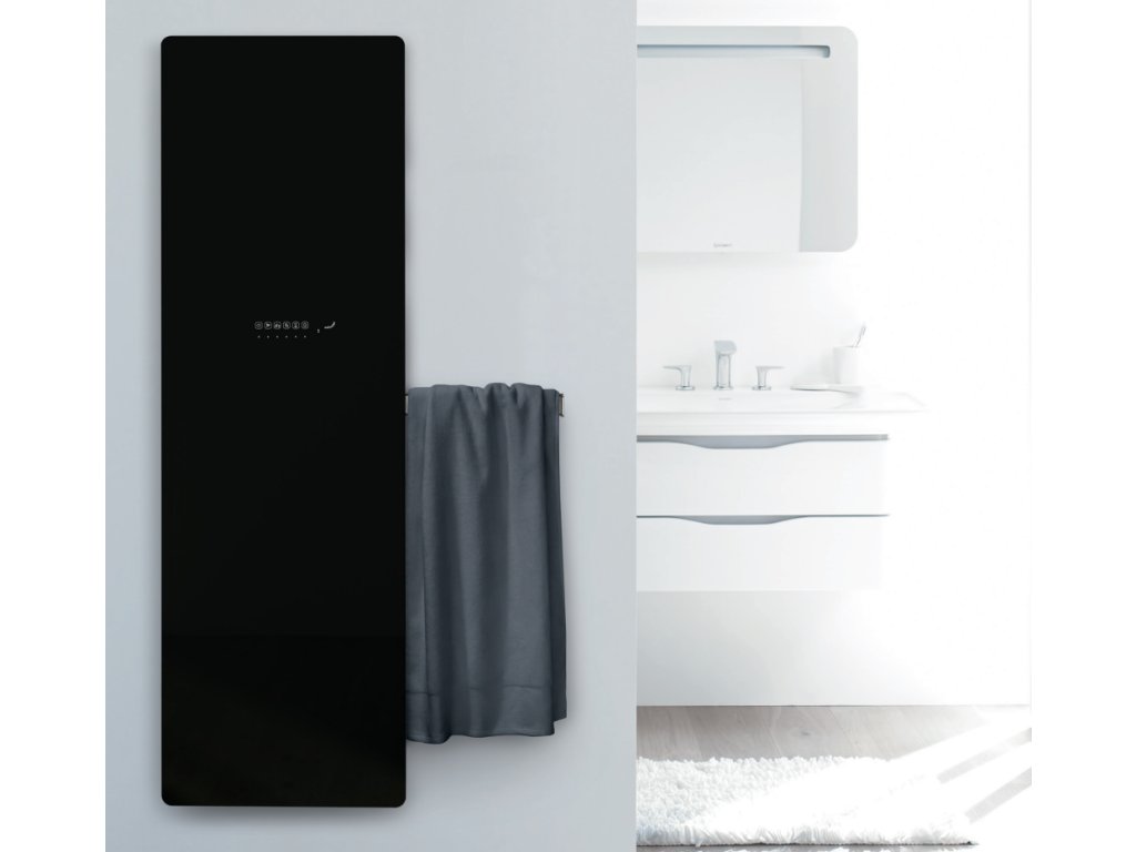 Elektrický skleněný radiátor Zehnder Deseo Verso z programu Studio Collection kombinuje moderní design s výjimečným komfortem a mimořádnou funkčností. Elegantní černé, bílé nebo zrcadlové vyhřívané čelní sklo vytváří z tohoto dekorativního radiátoru poutavý prvek, který se perfektně hodí do designových koupelen. V závislosti na výšce radiátoru je na zadní straně radiátoru upevněn jeden nebo dva výsuvné držáky pro sušení ručníků. Na nich ručníky zmizí za skleněným povrchem a koupelna vypadá vždy čistě a uklizeně. Každý detail je dokonale promyšlený.