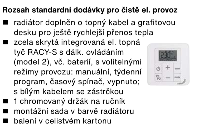 Dálkový ovladač na baterie Model 2 umožňuje komfortní regulaci pokojové teploty, individuální denní a týdenní programy vytápění, funkci 2 hod. časovače, detekci otevřeného okna aj. Ke chromovanému radiátoru navíc dodáván chromovaný rámeček ovladače.