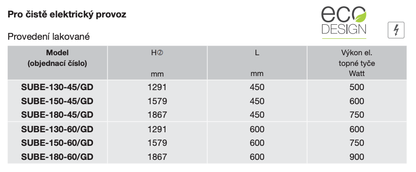 Designový radiátor Zehnder Subway pro čistě elektrický provoz se skládá z přesných ocelových vodorovných trubek a obvodových trubek čtvercového průřezu, dokonale svařených laserovou technikou bez viditelných svárových spojů. Elektrická topná tyč RACY-S elegantně integrovaná ve spodní části rámu radiátoru, s přívodním kabelem (1,2 m) se zástrčkou, vestavěná vpravo dole. S ochranou proti provozu bez topného média, stupeň ochrany IP44 (proti stříkající vodě), pro připojení do sítě 230 V. Samostatné dálkové ovládání na baterie (model 2), pro regulaci teploty v místnosti. Radiátory lakované základní a vrchní práškovou barvou, standardně v bílé barvě RAL 9016, na přání ve speciálních barvách, chromované nebo v provedení z kartáčované nerezové oceli V4A. Součástí dodávky designové stěnové konzole v barvě radiátoru.