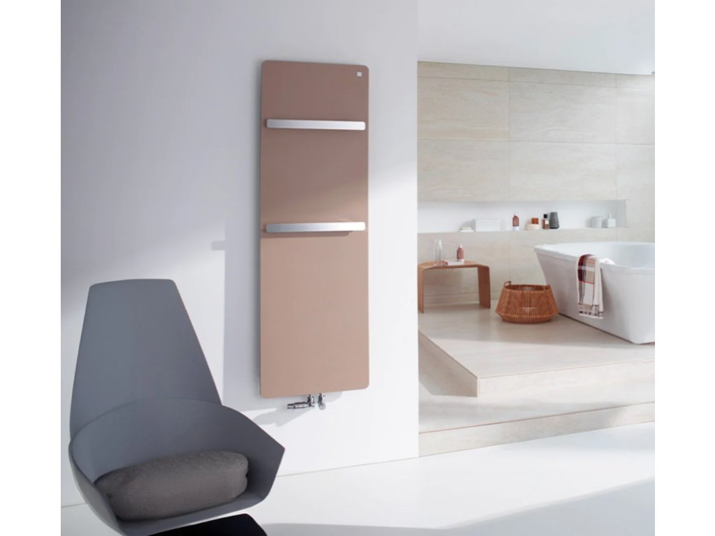 Designový radiátor Zehnder Vitalo Bar s přední a zadní deskou vyrobenou z aluminia a vnitřním měděným registrem v hliníkovo/grafitové konstrukci.