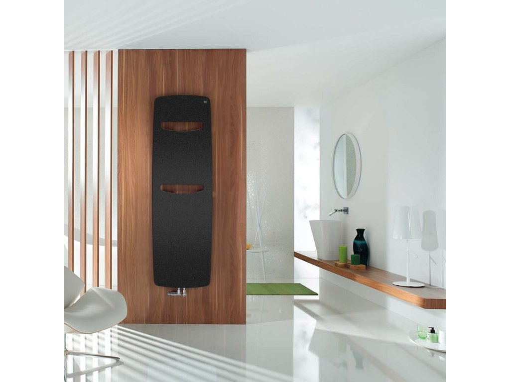 Designový radiátor Zehnder Vitalo Spa s přední a zadní deskou vyrobenou z aluminia a vnitřním měděným registrem v hliníkovo/grafitové konstrukci. Vše dokola uzavřeno rámem z černého polyamidu. Doplněno jedním nebo dvěma otvory na ručníky.